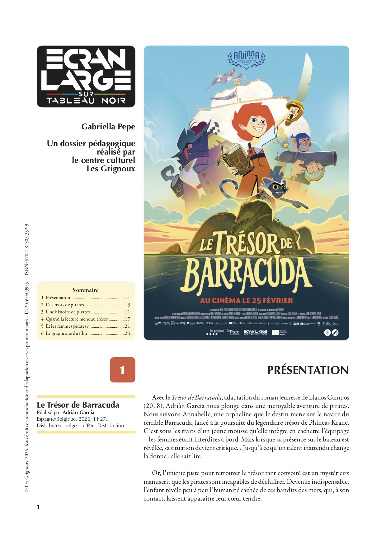 Porté par une animation éclatante, Le Trésor de Barracuda nous invite à embarquer pour un voyage aussi drôle que palpitant, peuplé de personnages hauts en couleur, d’énigmes à résoudre et de dangers à surmonter : tous les ingrédients d’un grand récit d’aventures. À travers les activités proposées dans ce dossier, les élèves de 6 à 8 ans pourront enrichir leur vocabulaire grâce aux mots liés au monde de la piraterie, découvrir les codes du genre, réfléchir à des thématiques telles que le rôle de la lecture ou la place des personnages féminins dans ces univers fictionnels, tout en laissant libre cours à leur créativité en s’intéressant au graphisme du film. Une belle façon de prolonger l’aventure en classe.