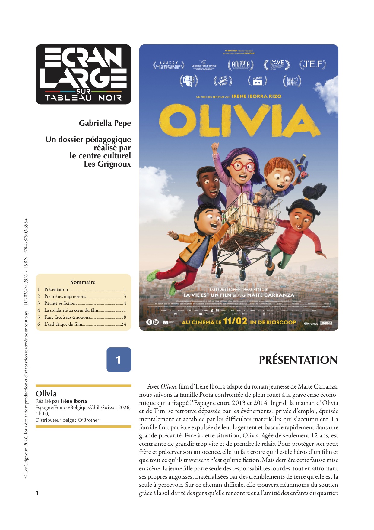 Bien qu’ancrée dans une réalité espagnole, l’histoire de cette mère de famille et de ses deux enfants est universelle. Ainsi, Olivia aborde des thèmes sociaux complexes, mais avec beaucoup de douceur, de lumière et de sensibilité, en adoptant le point de vue des enfants. Ce dossier pédagogique, pensé pour des élèves à partir de 9 ans, propose des activités qui permettront d’ouvrir un espace de réflexion autour de questions de société telles que la précarité, la solidarité, la force des liens familiaux, mais aussi l’importance de l’imagination comme refuge et moyen d’évasion. Enfin, une attention particulière sera portée à l’univers graphique du film : une activité sera consacrée à mieux appréhender la technique de l’animation en stop-motion, tout en proposant aux élèves de réaliser un projet créatif.