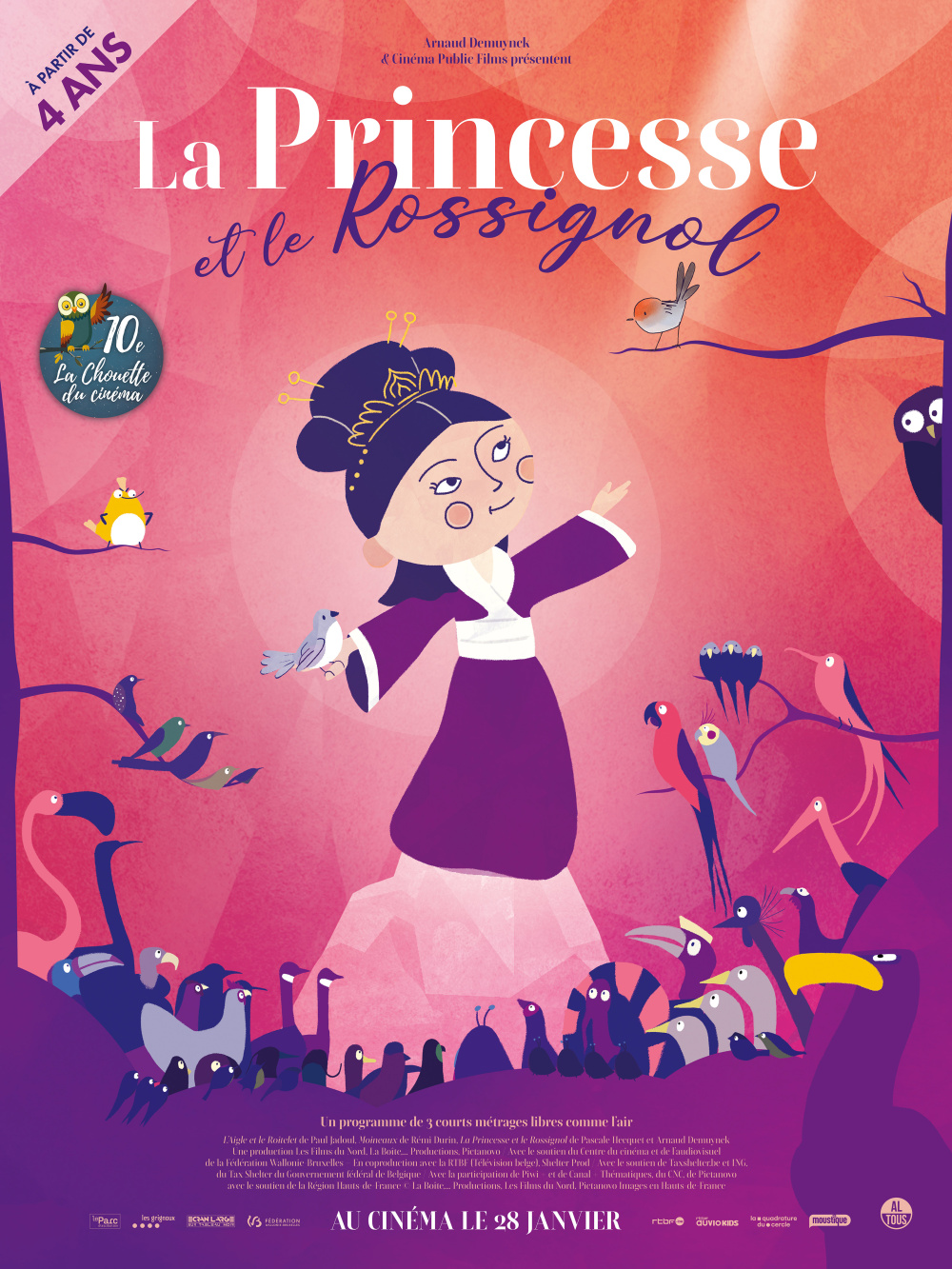 Voici le 10e programme de La Chouette du cinéma ! Pour fêter cet anniversaire important, Arnaud Demuynck, créateur de cette Chouette très aimée des enfants et producteur du programme, nous propose cet ensemble poétique de trois courts métrages aux couleurs chatoyantes, tournant autour de l’univers merveilleux des oiseaux, et qui traite de liberté et d’amitié à hauteur d’enfants